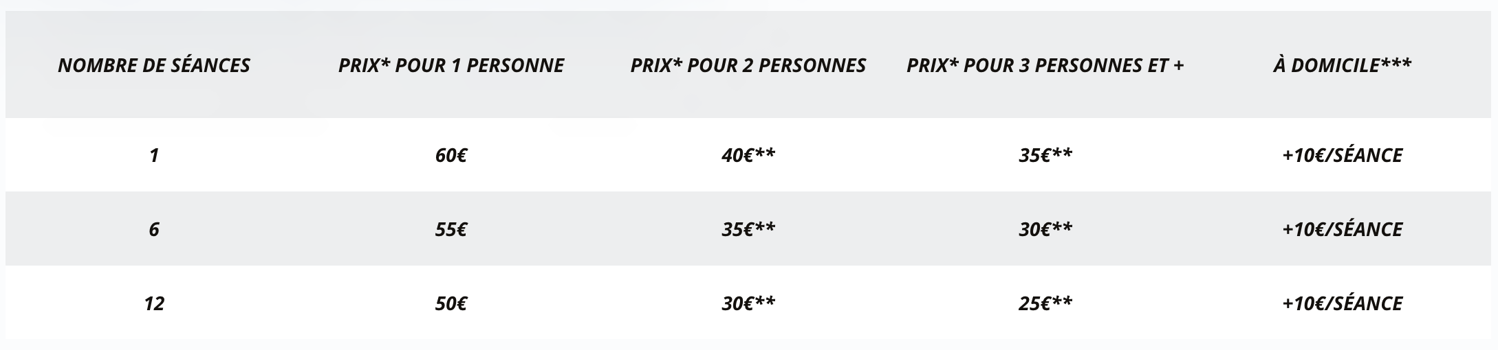* Prix en € TTC ** Par personne et par séance ***Supplément de 10€/séance pour les coachings à domicile
